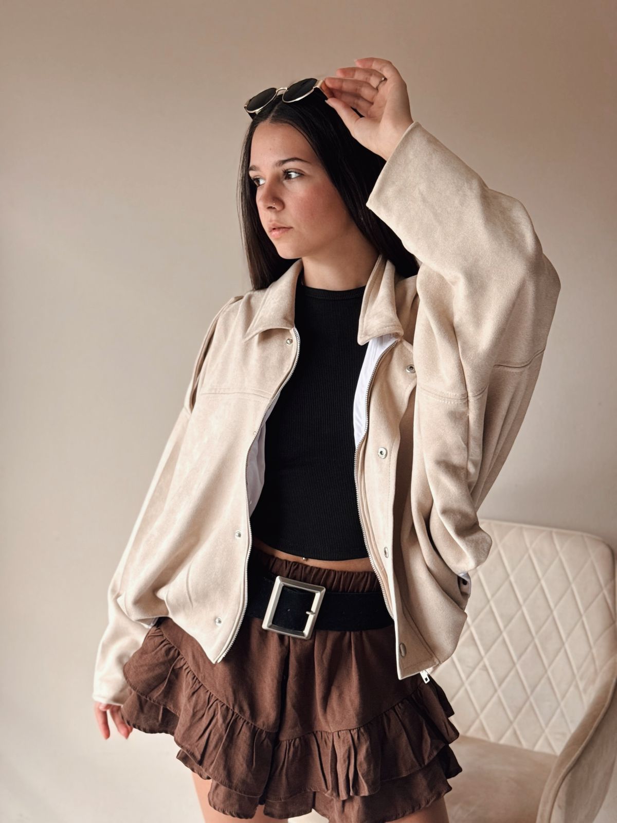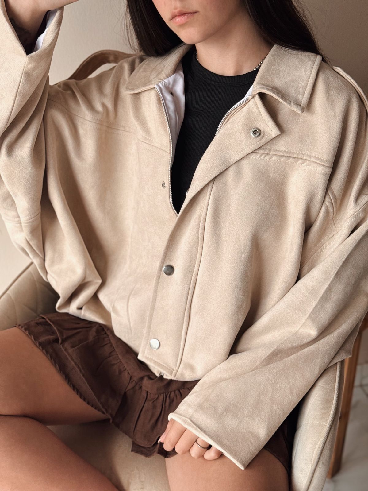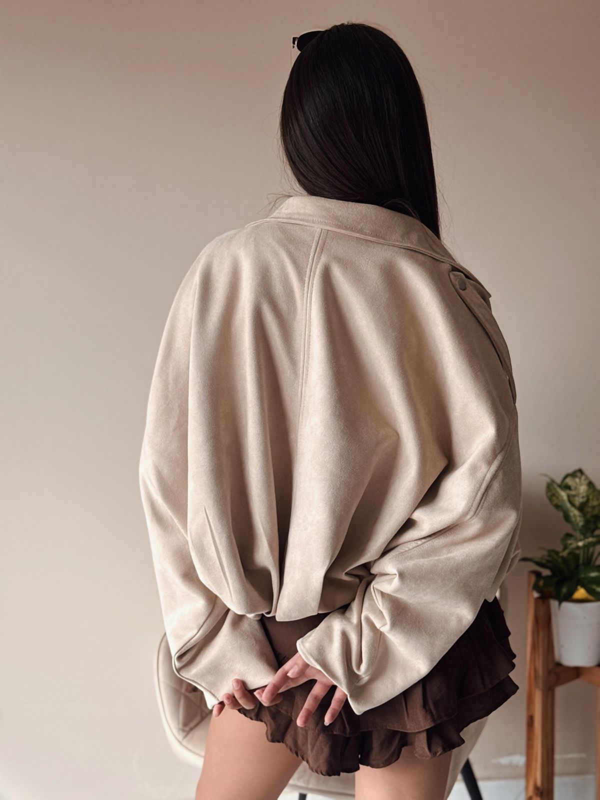 Campera estilo bomber gamuzada por fuera. Su interior es forrado. Mangas murcielago.