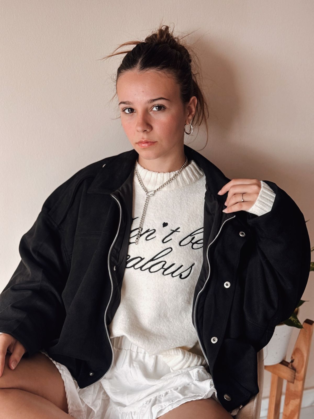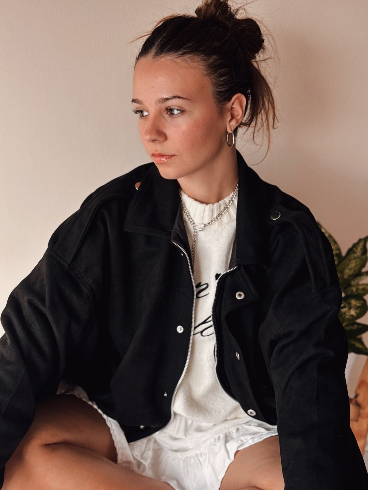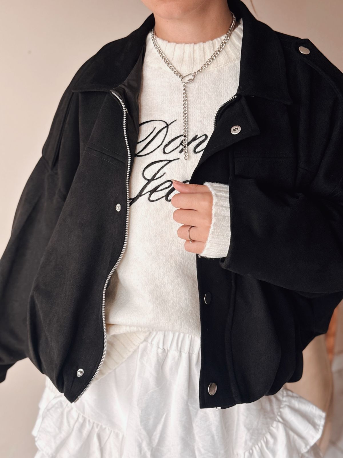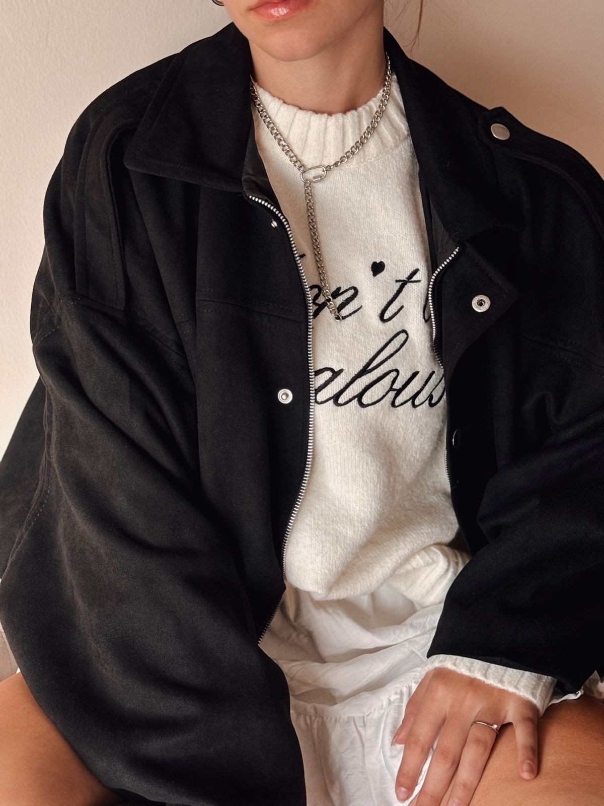Campera estilo bomber gamuzada por fuera. Su interior es forrado. Mangas murcielago.