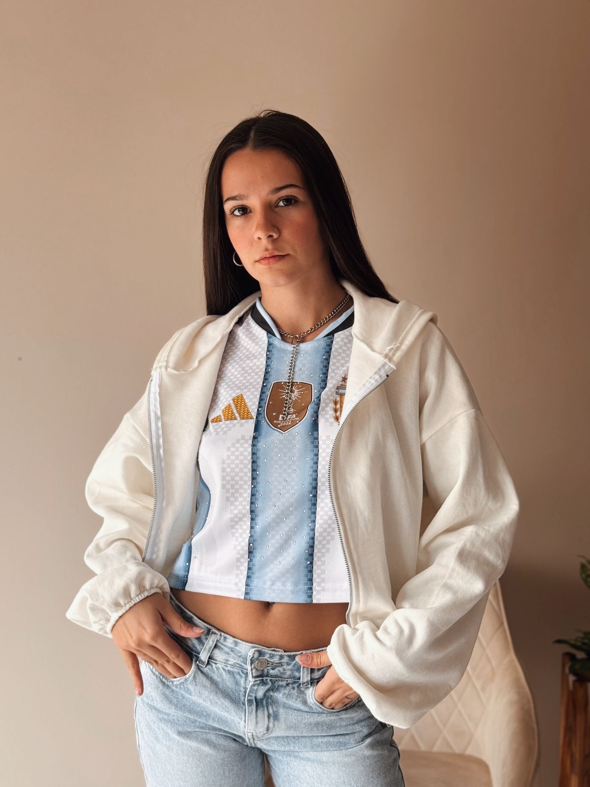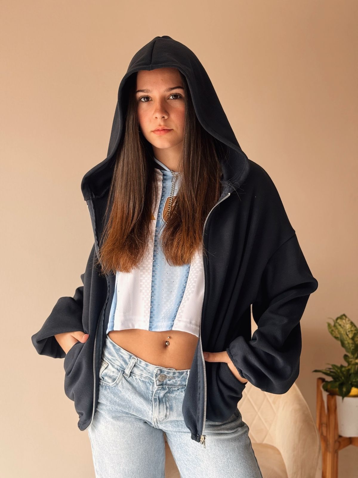 Campera de algodon frizado con capucha y bolsillos. En sus puños y cintura tiene elastico. El talle abarca hasta un XL.